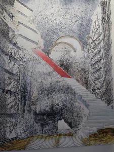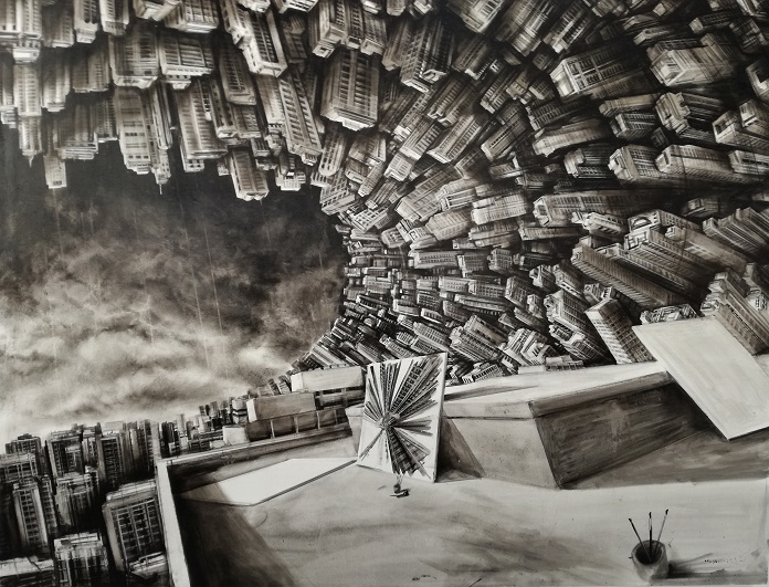 Oppure il dipinto olio su tela con una città che si accartoccia su se stessa, le case si chiudono ad anello, avviluppano tutto, il cemento ricopre anche il cielo in una morsa tenebrosa.