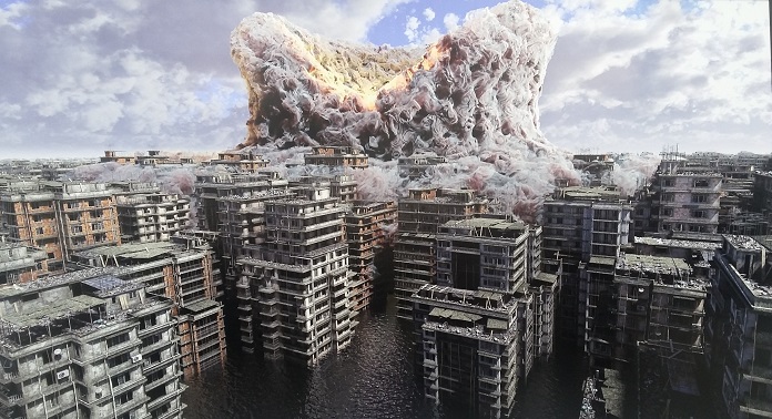Spesso il tema dell’inquinamento fa capolino tra le opere, come in un’istallazione dove sul pavimento c’è terra mista a petrolio e sullo sfondo un disco grigio che simboleggia la terra, ormai ferita a morte. Oppure nella città allagata e martoriata da un enorme cratere, un dipinto quasi apocalittico, eppure di sicuro impatto visivo.