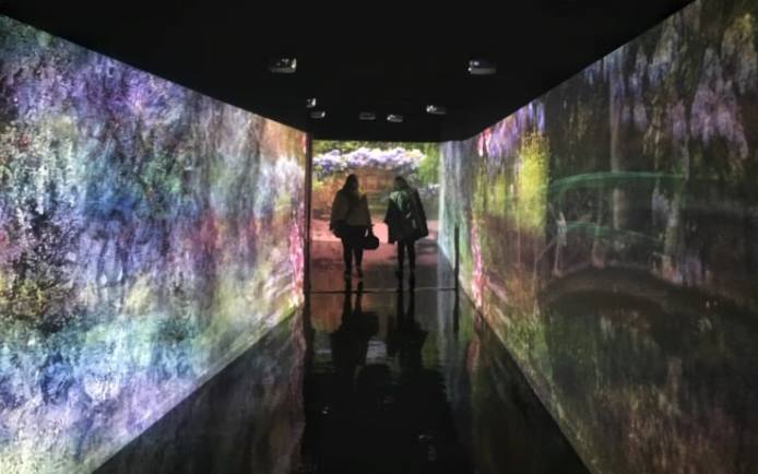 Menzione speciale per questa mostra forse minuta in termini numerici ma straordinaria forse proprio per il suo stile raccolto, i due tunnel in mapping, quello d’ingresso che ricostruisce il ponticello sul lago di ninfee e il secondo poco prima dell’uscita, un vero e proprio passaggio sull’acqua, dove piedi e mani dei visitatori sfiorando le pareti riproducono i cerchi concentrici dello specchio lacustre, mentre coloratissime water lilies scivolano languide qui e lì.