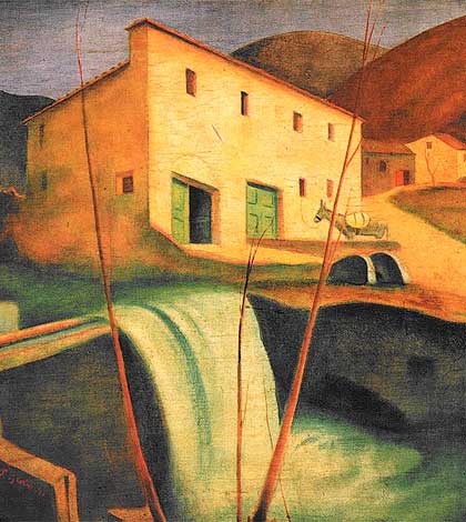 [rating=4] Il gesto di Pietro Bugiani accompagna lo sguardo a una dimensione terrena, naturale, contadina; quasi miracolosa. Il paesaggio pistoiese novecentesco – con i suoi campi, le aie, i casolari isolati – sulla tela è tuttavia sfumato e, talvolta, privo di connotati; descritto limpido o annebbiato, in un’approssimazione onirica che ricorda gli impressionisti francesi. L’uso del colore in Bugiani è anch’esso non materico ma riflessivo, spirituale, interrotto poi in un dettaglio acuto: un celeste più acceso, o un rosso che infiamma il soggetto. Basti pensare all’irrealismo della Madonna col manto rosso (1931 ca), dove la mano femminile squarcia l’abito, concentrando il picco emotivo in una fessura, mentre intorno il paesaggio pare inconsistente.