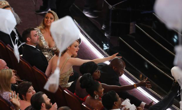 Esulta tutto il cast, lo staff tecnico, i produttori. Salgono sul palco, mentre una voce fuori campo elenca le nomination e i riferimenti necessari del film. Il produttore Jordan Horowitz, non è neppure il primo a ringraziare, quando, appena iniziato il suo discorso, sul palco si cominciano a vedere strani movimenti ed espressioni.