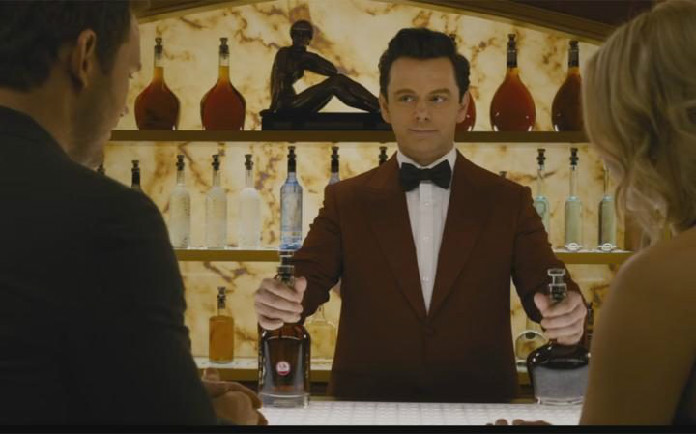 Gli attori sono pochi, come vorrebbe Aristotele (Poetica), ma la recitazione non brilla per empatia o intensità. Così è soprattutto per Chris Pratt (I Guardiani della Galassia, 2014), che veste i panni del meccanico Jim Preston: il suo volto è prima coperto dalla barba incolta, poi fissato in un’unica espressione di patetico sgomento. Più versatile ed efficace è Jennifer Lawrence, che interpreta la bella e avventurosa scrittrice Aurora Lane, di cui Jim s’innamora perdutamente. Laurence Fishburne (Morpheus di Matrix, per intendersi) incarna un membro dell’equipaggio di nome Gus Mancuso; ma la sua performance è troppo breve perché se ne possano apprezzare sfumature o svettamenti. Allo stesso modo, la presenza di Andy Garcia si riduce ad un muto e rapidissimo cammeo. Buona, invece, la tenuta di Michael Sheen (Frost in Frost/Nixon – Il duello, 2008) nei panni dell’androide Arthur: fissità e minimalismo espressivo, qui, sono richiesti dal ruolo. Lo accompagna la voce di Oreste Baldini, che sceglie toni caldi e rassicuranti, pur conservando preziose venature sarcastiche.