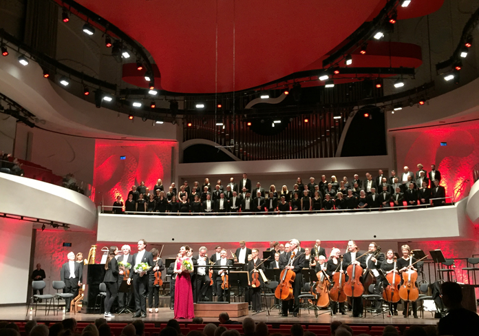 Nella contemporanea sala dominata da morbide e sinuose siluette rosse e bianche, colori nazionali, il programma si è aperto con lo Stabat Mater di Francis Poulenc, un’opera straziante composta in soli due mesi in ricordo della perdita dell’amico pittore e scenografo Christian Bérard. L’opera si presenta come un grande affresco per soprano, coro misto e orchestra, costruito su dodici sezioni dal carattere fortemente drammatico. Fabrice Bollon ne sottolinea la grande varietà di espressioni, insieme alla ricchezza timbrica e armonica, con una direzione piena di fervore, dove la soprano Irma Mihelic ne coglie con lirismo ogni più piccola sfumatura.