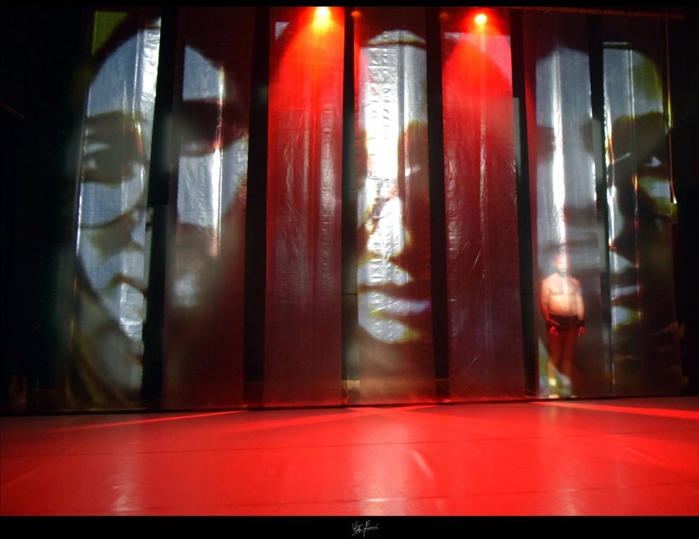 Una performance a tratti opprimente, Radio Golgota, ma alleggerita allo stesso tempo, dalla scenografia fatta di strisce che calano verso il basso, proiezioni video, un contemplare che punge sul vivo, una essenzialità in cui l’umanità di Cristo è un dono allo spettatore.