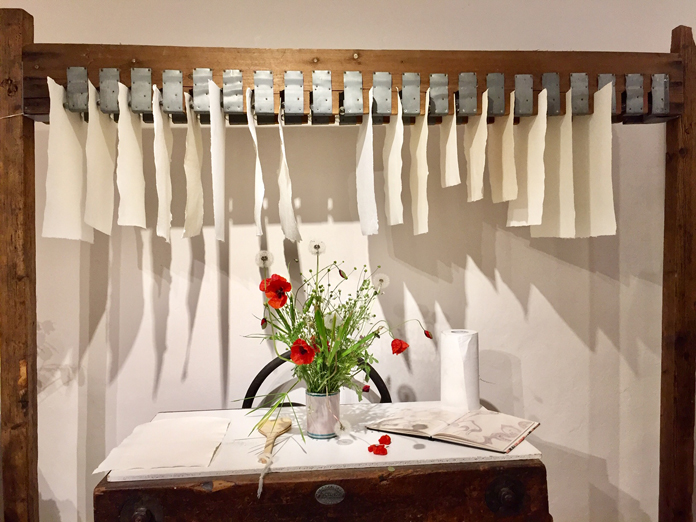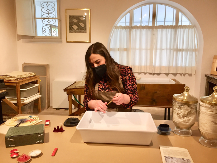 Appena arrivati all’interno della corte in Via dei Serragli n. 104, nell’Oltrarno fiorentino, siamo stati guidati in piccolo gruppo alla scoperta dell’Atelier degli Artigianelli, un luogo fuori dal tempo. Tra antiche stampe dai colori danteschi e gli arnesi del mestiere, ammaliati da profumi remoti, arriviamo nella piccola cartiera, nata nel 2018 grazie ad un progetto MIBAC in collaborazione con il Museo della Carta di Pescia e l’Impresa Sociale Magnani di Pescia con lo scopo di diffondere la cultura e le tradizioni della carta fatta a mano. Un piccolo angolo con un’impronta anche ecosostenibile, visto che gli impasti sono per la maggior parte prodotti con cellulosa di scarti di recupero.
