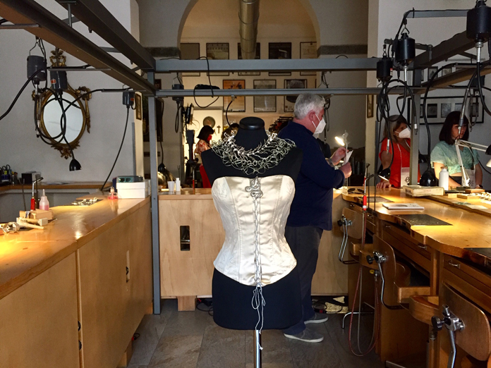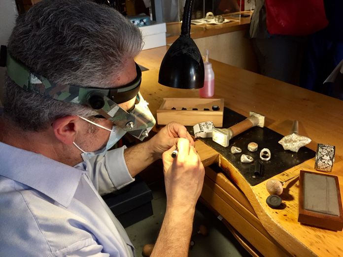 Scesi al piano terra, il laboratorio apre davanti ai nostri occhi un mondo completamente diverso, con lunghi tavoli intervallati da artigiani intenti nella lavorazione di metalli e nell’intarsio. Maestri con oltre 30 anni di esperienza ed allievi, ognuno con una storia da raccontare, ci narrano il design del gioiello, la raffinata, ricercata, sottile arte dell’incisione a bulino su lastra. Ammiriamo incantati preziose incisioni dalle splendide rifiniture, la sofisticata tecnica dell’incassatura delle pietre su semilavorati in argento e altre leghe, la progettazione e il disegno di vere opere d’arte.