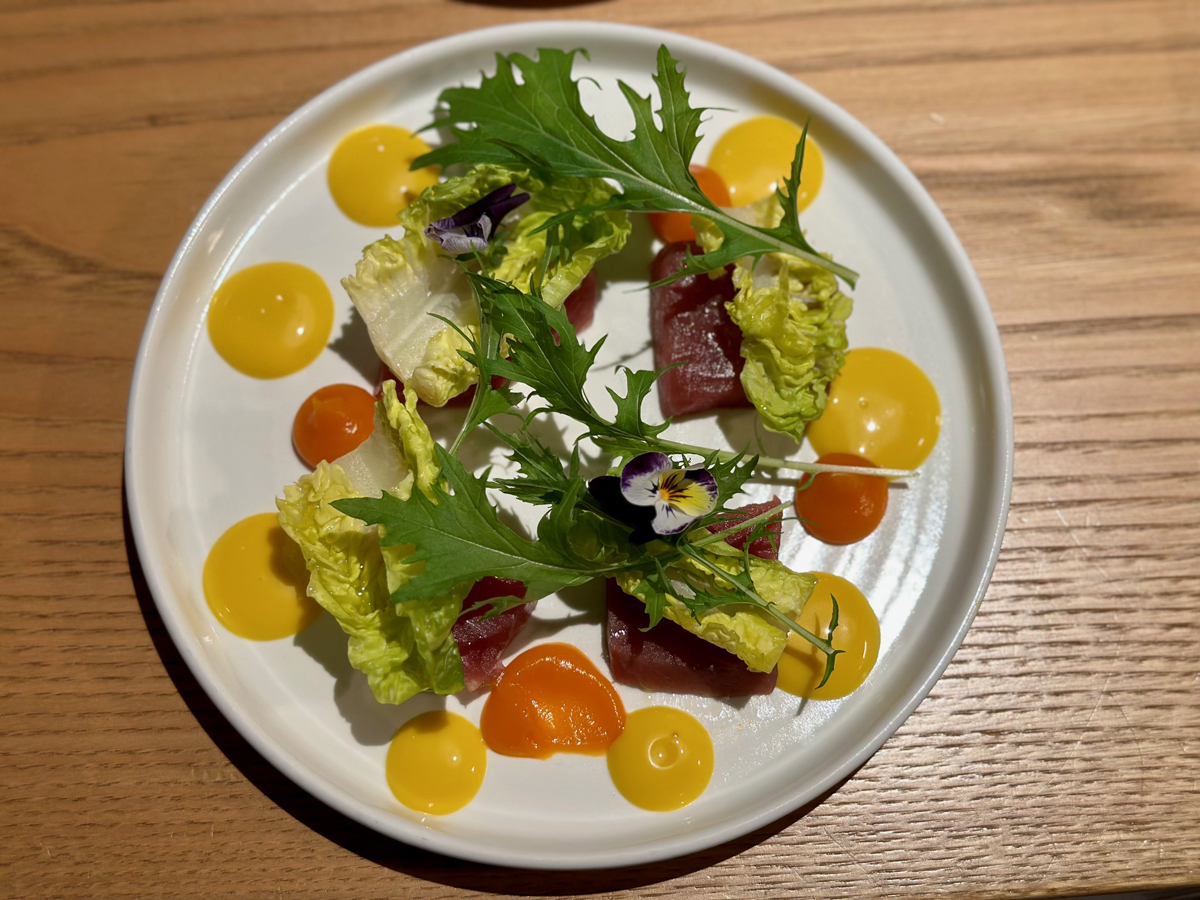 L’antipasto è una tavolozza colorata con tonno sashimi, gocce di salsa alla zucca e salsa al mango e wasabi, foglie di lattuga e fiori freschi: un piatto leggero, accompagnato da pane fatto in casa dalla bella forma sferica con olio della Tenuta Maso Bòtes.