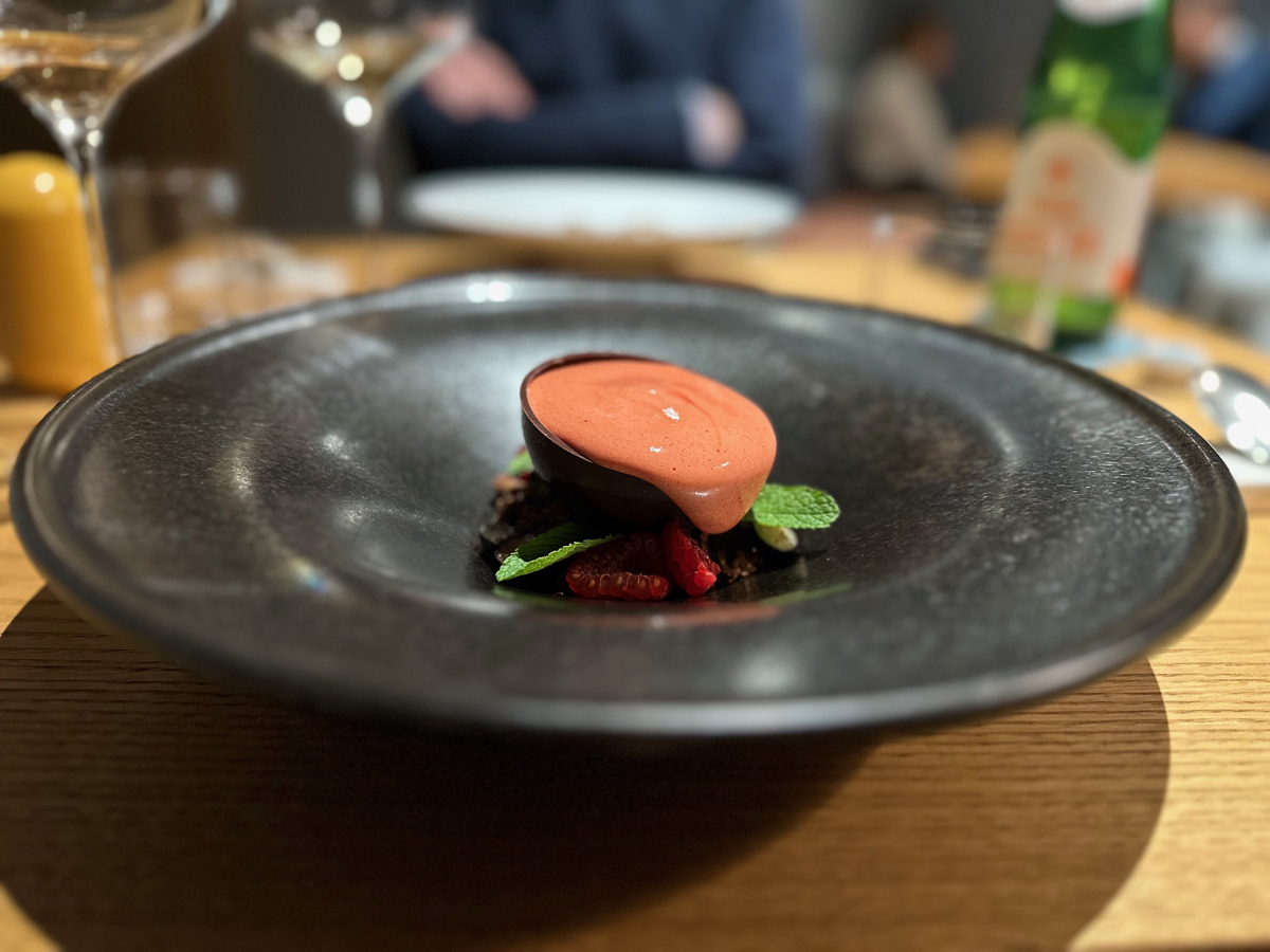 Dulcis in fundo, la nostra degustazione termina con zabaione ai frutti di bosco a nascondere una mousse al cioccolato fondente su sfera di cioccolato, con crumble croccante, lamponi freschi e menta. Ottima chiusura per un percorso fresco e delicato, in una bella cornice di design ed equilibrio di forme e gusti.