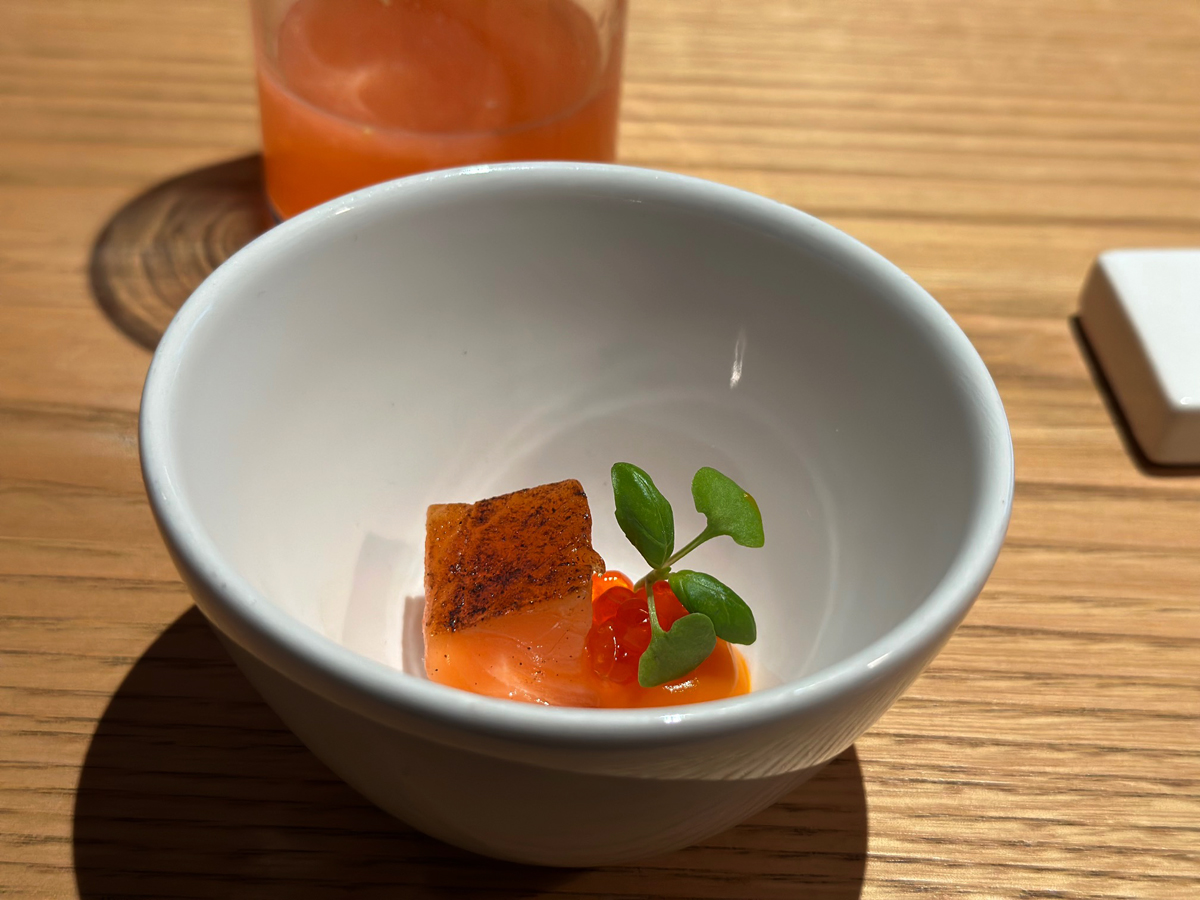 Un elegante Corvée Rosé Trento doc inizia il percorso accompagnando il primo entrée: salmone marinato nel caffè su crema di zucca e caviale, da gustare con un analcolico di frutti rossi, anguria e bitter, per un fresco incipit.