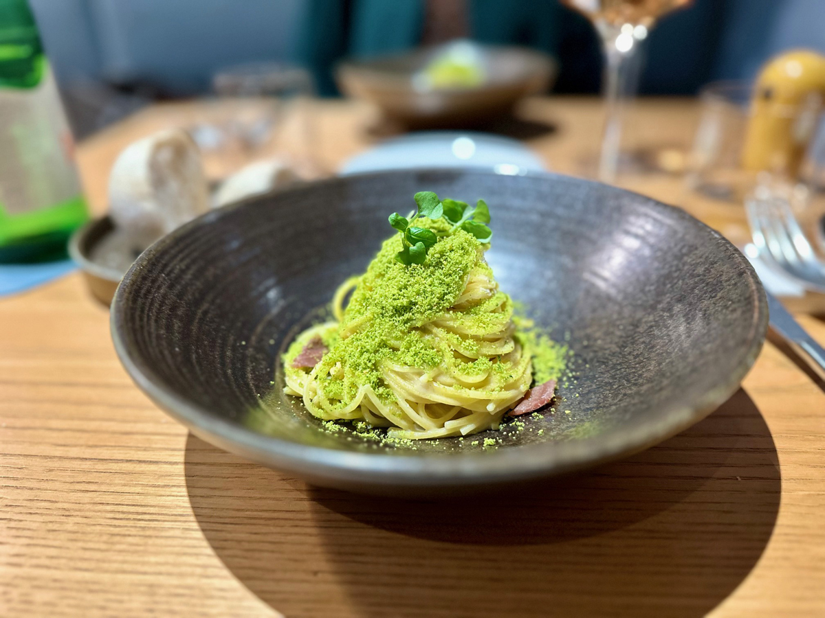Si prosegue con un primo dagli ingredienti semplici ma di prima qualità: tonnarelli saltati nel burro con alici del Cantabrico e crumble di erbe aromatiche. Una genuinità che appaga vista e gusto.