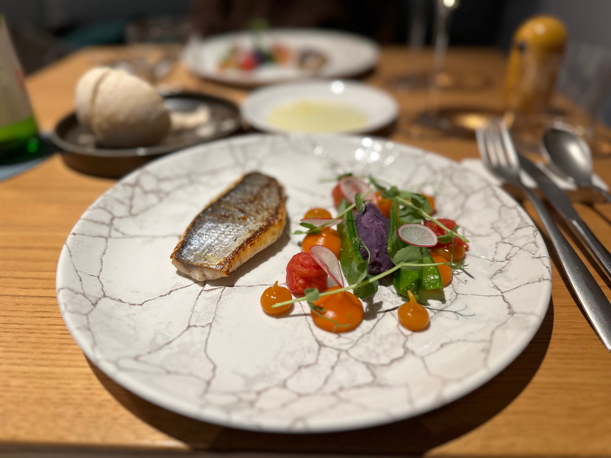 Filippo Sartori, patron e maitre di sala, ci accoglie in modo premuroso, raccontandoci il suo menù, che varia circa ogni due mesi, attento alle stagionalità con pochi ma curati piatti, diviso tra Terra, Acqua e Aria, rispettivamente carne, pesce e vegetariano. Noi proviamo il menù degustazione di pesce.
