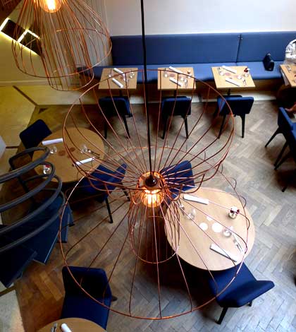 L’illuminazione proviene anzitutto dalla luminosità naturale che fornisce la vetrata. È completata da delle lampadine, incastonate in maniera irregolare nel muro, così come da dei lampadari in rame che dovrebbero evocare la struttura di una pergola.