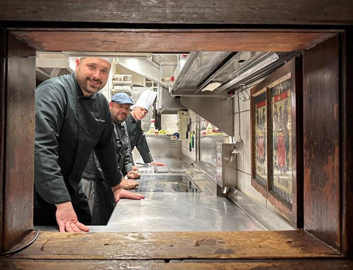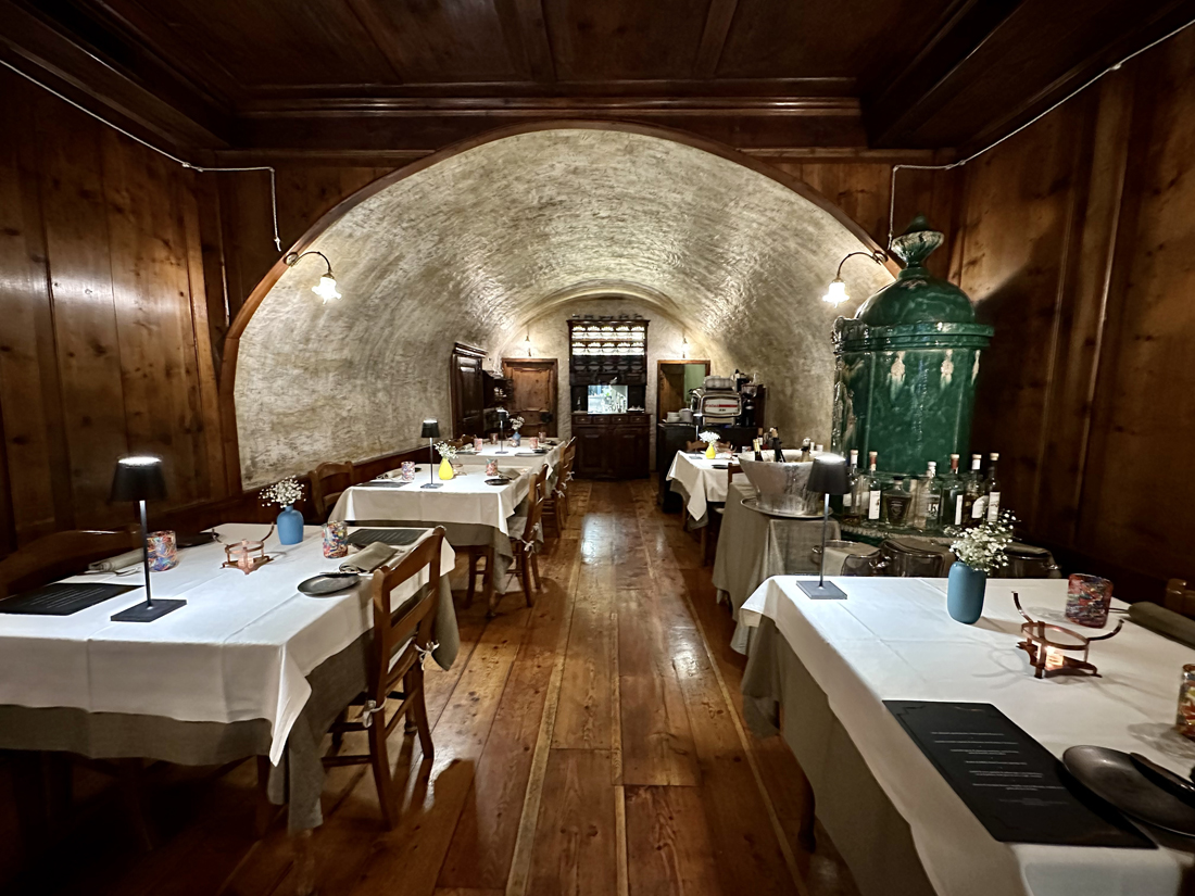 La storica atmosfera intima e accogliente si è preservata nel corso dei secoli: oggi il locale, gestito con lungimiranza da Andrea Coluccia, si presenta come una stube in legno dal grande fascino, con una volta a botte in pietra ed oggetti d’epoca di pregio come la grande stufa in maiolica verde della Val di Non. Particolarissima la cucina a vista, nascosta dietro una vecchia credenza. I suoi otto tavoli sono apparecchiati con eleganza classica – la doppia tovaglia – con punte moderne – i centrotavola e i bicchieri colorati. Ed il menù preserva entrambe queste anime, classica e moderna.