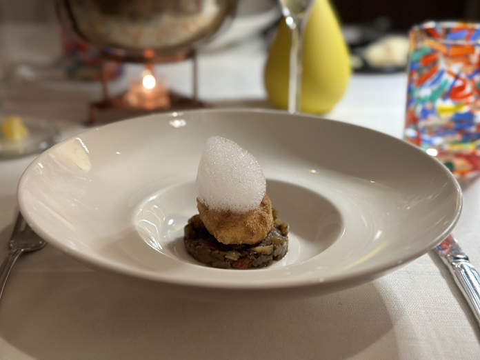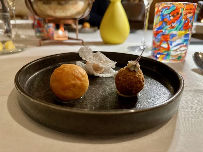 L’accoglienza è rilassata, con un calice di Cime di Altilia Trentodoc 2016, invecchiato 50 mesi, una bollicina molto piacevole che non resta nel palato, ad accompagnare un grazioso entrée dello chef Simone Bordignon: un arancino di riso con aglio nero, due chips di tapioca al foie gras, una crocchetta di Trentingrana con gel di yuzu.