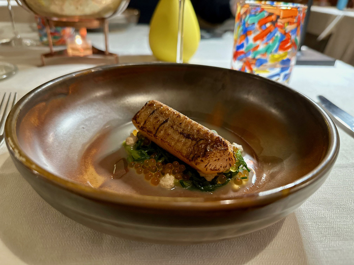 L’aria torna fresca e marina, con uno dei piatti climax del percorso culinario: casoncelli ripieni di salmerino marinato, adagiati su una crema di carote e pennellate di salsa di friarielli, con gocce di arancia salata, uno stupore per vista e palato. Il tutto accompagnato da un calice di Kerner Köfererhof, un bianco fermo, profumato e fruttato, dotato di grande sapidità e mineralità, ottimo accostamento.
