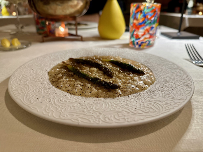 Con il risotto mantecato al midollo, polvere di limone bruciato e asparago verde si torna alla terra, tra affumicatura e freschezza del limone.
