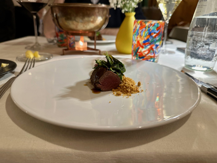 Per immergersi quindi nel fitto del bosco con il lombo di cervo adagiato su una ganache di sedano rapa e cioccolato bianco con terra di polenta e cicorietta, servito con una demi-glace di cervo e caffè. Una selvaggina tenerissima, alleggerita da un tondo calice di Lagrein Greif, fresco e piacevole, dalla bella struttura, ed un retrogusto fruttato di ciliegia, mora e ribes.