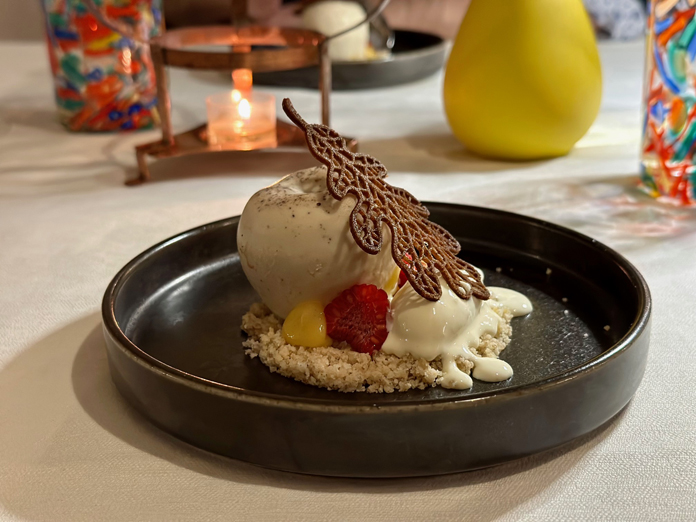 Una mousse di cioccolato bianco e cannella con inserto alla mela su crumble di noci e gelato alle fave di Tonka ci guida ad un dolce e delizioso finale.