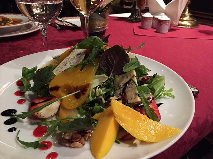 Si parte con due diversi antipasti: un gran mix di fresca insalata (valeriana, radicchio, basilico) unito a pere sciroppate, noci tostate, fragole e gorgonzola, con gocce di aceto balsamico, ed una tradizionale zuppa di pesce con salmone e gamberi dal gusto deciso.