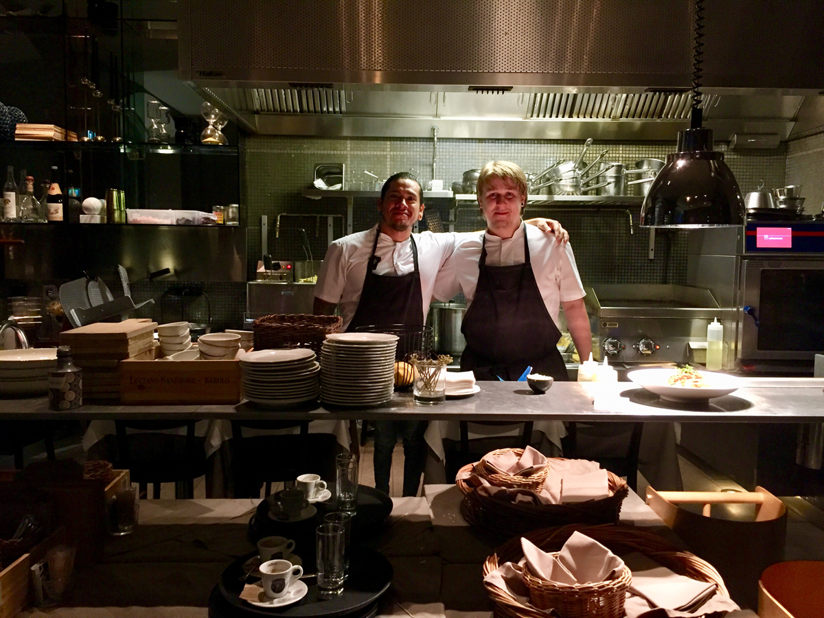 L’accoglienza è ottima, il maître ci fa accomodare all’interno, davanti alla bella cucina a vista, e ci serve subito un bicchiere di champagne per un brindisi di benvenuto.