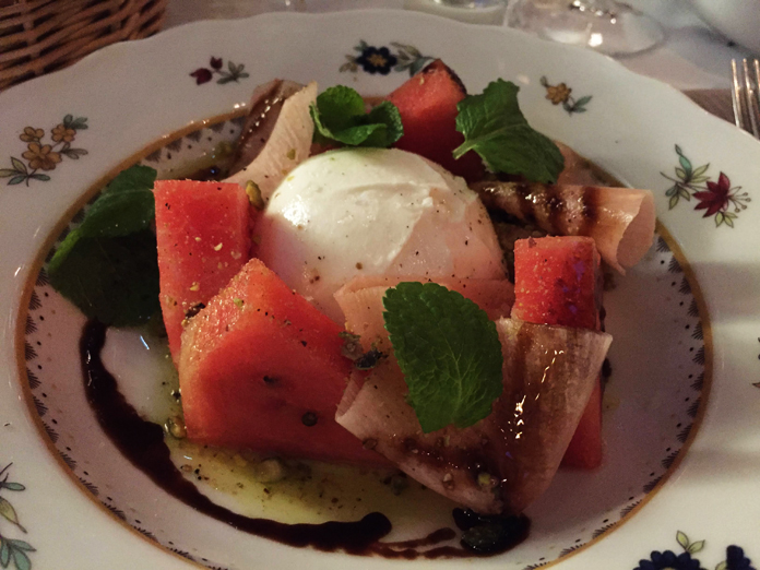 Quindi si parte con l’antipasto, una vera prelibatezza: un ricco piatto di prosciutto Pata negra riserva di 36 mesi servito con il melone, binomio perfetto ed estivo.