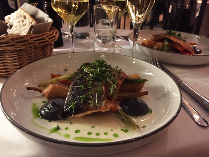 Il tutto abbinato ad un buon bicchiere di Constitution Road Chardonnay 2020, dai ricchi aromi intrecciati di agrumi, un accostamento ottimo per il secondo: salmerino alpino saltato in padella con verdure di stagione, salsa di champagne, emulsione all’aglio nero, uova di trota salmonata, olio di Ramsons selvatico. Un piatto raffinato e leggero, dal gusto elegante.