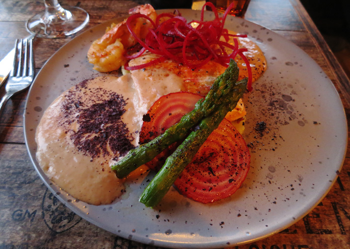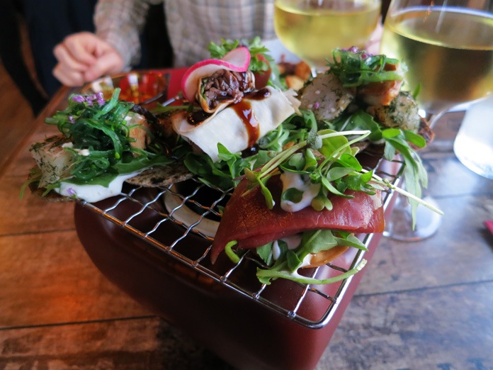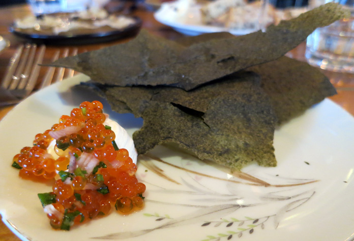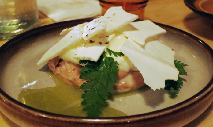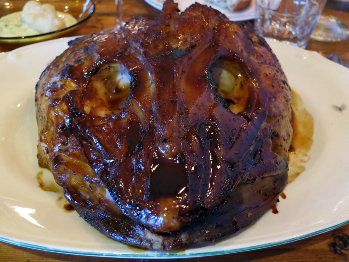 Le singole specialità sono da una parte le chips di alghe e la trota salmonata con rafano e pane tostato e dall’altra bocconcini di agnello ricoperti di erbe e senape e agnello affumicato con noce moscata, dal sapore intenso e deciso. Ma i veri piatti forti sono la scenografica e allo stesso tempo inquietante enorme testa di merluzzo, dalla lunga lavorazione e dal gusto squisito, ’caramellata’ sul momento prima di servirla con una viva fiamma, ed il cuore d’agnello.