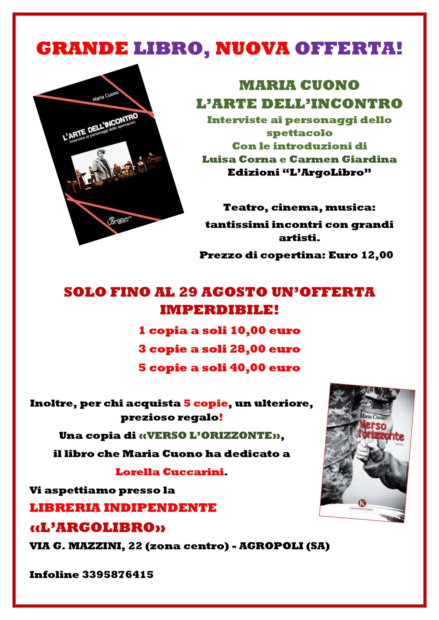 REDAZIONALE. In offerta fino al 29 agosto 2021 L’Arte dell’Incontro – Interviste ai Personaggi dello Spettacolo, edito da L’Argolibro, l’ultimo lavoro di Maria Cuono, giornalista e scrittrice, un omaggio agli artisti che affrontano tantissime difficoltà per il proprio lavoro a causa del Covid 19.