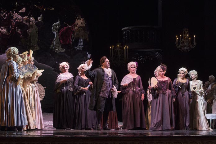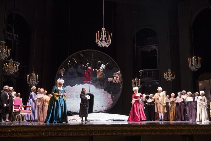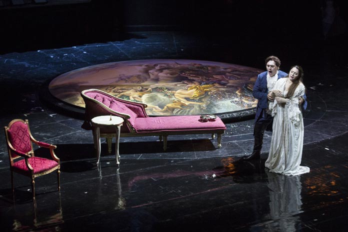 Cerca allora di mantenersi distante, il regista Lorenzo Mariani, con la complicità delle sontuose scene di Nicola Rubertelli e i costumi di Giusi Giustino, da ogni tentazione verista o anche solo naturalista: sotto i grandi archi azzurri del fondale s’intravvedono palchi teatrali, e non solo nel primo atto, il più decisamente e dichiaratamente metateatrale, ma pure nella scena del villino della Duclos del secondo atto, nella grande sala da ballo del terzo, perfino nel salottino di Adriana dell’ultimo, dove un pesante tendaggio cadrà, nel pieno del delirio finale, per rivelare la tela teatrale sotto le cui insegne Adriana reciterà l’ultima volta. È il teatro il vero protagonista di Adriana Lecouvreur, il teatro che è sempre sotto, accanto, in trasparenza alla cosiddetta realtà, che incrocia, conduce, segue, la vita vera, inscindibilmente legato ad Adriana e alla sua vicenda terrena: motivo di felicità, certo, ma in qualche modo anche limite, dorata quanto evanescente prigione, simbolo d’un guardarsi vivere che, a poco a poco, lentamente, lascia passare il tempo fino a che, come dice il buon Michonnet, ci si lascia vivere “per abitudine”. Tentazione, quella di lasciarsi andare in una quieta e scontata ordinarietà che, invece, non sfiora nemmeno il sempre dinamico direttore, un entusiasta e performante Daniel Oren, che trascina, come suo solito, orchestra e cantanti con una conduzione sempre ispirata, serrata, appassionata. Persino i suoi mugugni, ben udibili fin dal fondo della sala, han finito per non disturbare più di tanto, visti i tempi perfetti, gli attacchi precisi, le dinamiche incalzanti: molti gli applausi per lui alla fine, sicuramente il più premiato dal pubblico insieme a Barbara Frittoli. Espressiva e delicata come sempre, la voce del soprano milanese è apparsa morbida e sensuale, dalla linea di canto elegante e curata: l’emozione filtra attraverso le note de Io son l’umile ancella per spezzarsi su Poveri fiori, dimostrando, ove mai ce ne fosse necessità, di saper sfoggiare al meglio le caratteristiche precipue della sua voce: espressione, timbro, legato, sfumature.