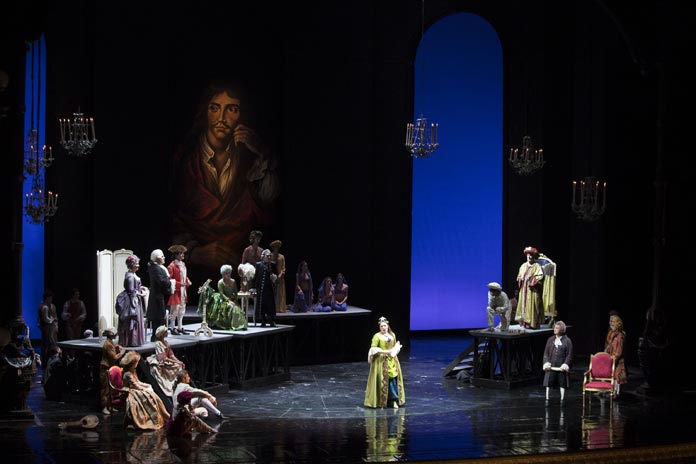 [rating=3] Il grande ritratto di Molière, gigantesca riproduzione di quello dipinto da Charle-Antoine Coypel e oggi conservato alla Biblioteca della Comédie-Française – sarà un caso, realizzato proprio in quel 1730 che vide la morte della protagonista, nel mondo reale – che incontrastato domina la scena all’alzarsi del sipario, come l’effige d’un dio pagano, enuncia in modo inconfutabile quella che sarà la cifra, la caratterizzazione, il centro intorno al quale dovrà necessariamente ruotare tutta la rappresentazione: il teatro e la vita del teatro e come questa incroci e attraversi e segni in modo indelebile le nostre povere vite.
