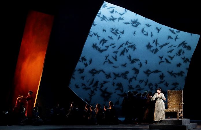 L’allestimento della Bischofberger non entusiasma e raccoglie sonori fischi. Non convince l’abbondanza di oggetti del tutto insignificanti e di incomprensibile utilità disseminati sul palco (ad esempio la schiera di scarpette, i ceri e i piccoli poliedri a L scuri attorno al trono, il grande specchio, lo stesso trono raffazzonato), nonché la presenza gratuita di grossi cani da caccia o della bambina nei panni di Elisabetta che compare qui e là con fare giocoso o il prigioniero maltrattato e bendato. Non convince l’impianto stesso della scenografia, di Eric Wonder, lo squarcio a forma di quadrato grossolano poggiante su un vertice che apre il fondale a videoproiezioni di uccelli neri e la gestione degli spazi attraverso pannelli mobili neri che non conferiscono riferimenti spaziali coerenti. Infine, i costumi, di Kaspar Glaner sono di foggia completamente diversa l’uno dall’altro, come se i personaggi siano di epoche diverse, ma senza una chiarificazione esplicita del senso di questa scelta (Enrico in mantelloni rinascimentali, Anna in lussuosi abiti da Traviata, Percy uscito da un film neorealista e Smeton con zimarra e tricorno alla Cherubino).