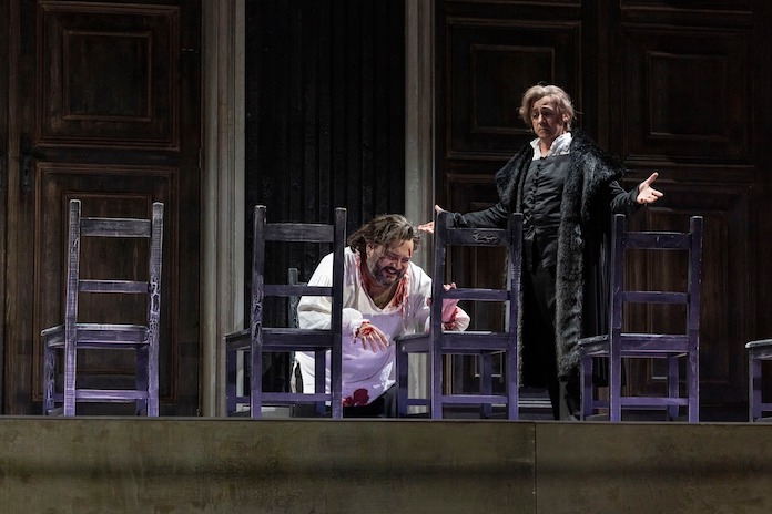 Anche al San Carlo – chissà come andrà a finire – dopo questa Anna Bolena attendiamo Maria Stuarda per la prossima stagione, tra un esatto anno, a giugno, e non possiamo che sperare di vedere Roberto Devereux nel 2025: questo, guerre politiche e istituzionali permettendo, naturalmente, e ogni riferimento a poteri capricciosi e indifferenti è quanto mai attuale. Costruisce, allora, la regista Jetske Mijnssen con l’aiuto della matita di Ben Baur un palazzo del potere caratterizzato da una disarmata semplicità che produce, invece, e per contrasto, effetti di sbalorditiva sontuosità, sbilanciato tutto verso il proscenio, oscuro nella sua stupefatta essenza che prende vita e luce solo da due enormi e gigantesche porte ai due lati del palcoscenico.