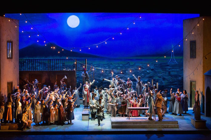 Così scrivevo nel 2015, quando, per il San Carlo Opera Festival di quell’anno, vidi per la prima volta questo che ritengo tra i migliori allestimenti di Bohème cui abbia mai assistito, per la regia di Francesco Saponaro, le scene e i costumi di Lino Fiorito, le luci di Pasquale Mari, e che ritorna in questi giorni al San Carlo, qui a Napoli: evidentemente il tempo ha infuso coraggio alle scelte registiche, ed oggi il Vesuvio è lì, in fondo, sulla sinistra, come nella più oleografica delle immagini della città, ma non al posto dell’Eiffel, che sta, invece, ancora, aguzza come sempre al posto suo, ma insieme ad essa, a testimonianza del sogno, della fondamentale irrealtà dell’impianto scenico, che gioca tutta la sua validità proprio sulla coesistenza di delirio onirico e profonda istanza sociale, scommettendo su una feconda possibilità dell’arte d’incidere, nel profondo, sulla società.