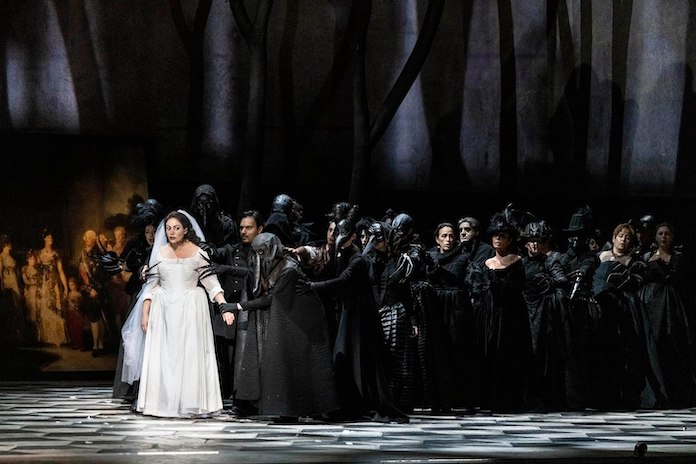 Muove, in questo spazio claustrofobico, un percorso che mette in scena le disforie della famiglia disfunzionale dei protagonisti, il cui ritratto s’incarna emblematicamente nella Famiglia di Carlo VI, capolavoro di Goya presente sul fondo della scena per tutta la durata della rappresentazione: notoriamente il pittore spagnolo rappresentò la famiglia (allargata) reale di Spagna, di molti secoli successiva a quella di Filippo e Carlo, in modo assolutamente realista, ma ciò che effettivamente ne vien fuori è un ritratto grottesco e al limite della caricatura, che tuttavia molto ci dice sui reali rapporti tra le persone raffigurate e, poi, sull’esito di queste nella più grande Storia. Il regista ci mostra il quadro nel primo atto, nel momento stesso in cui s’interrompe bruscamente il sogno d’amore di Carlo ed Elisabetta, per poi farcelo trovare storto al centro della scena, l’inclinazione – una dissonanza – accentua ansia e fastidio in chi, seduto in platea, guarda la scena, background noise che inquina la coscienza stessa del nostro sentire, interferisce con i sensi, ci rende più recettivi a peggiori eventi ed emozioni. Nel quarto atto il quadro diventa completamente buio, assorbe ogni luce, nell’ultimo atto, poi, spariti anche gli stalli lignei, Carlo lo staccherà dalla parete per metterlo a terra: sarà la metaforica tomba di Carlo Imperatore su cui pregherà la Regina, per poi mutarsi, svolgendo fino in fondo il suo ruolo di simbolico feticcio, in buco nero che lo stesso Carlo attraverserà nel suo viaggio verso un mondo migliore.