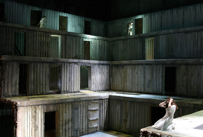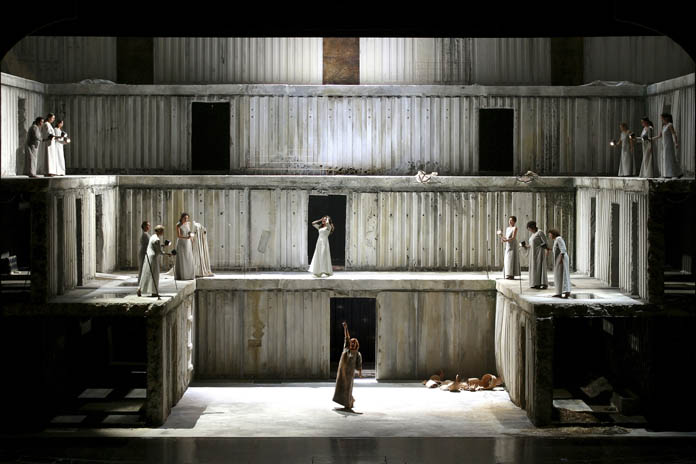 Cos’è la reggia degli Atridi, odiosa agli dei, conscia di molti consanguinei massacri, di teste mozze, macello di uomini, suolo impregnato di sangue, se non scarto rugginoso d’un passato arcaico e impenetrabile, irriducibile all’ego della ragione, decifrabile, nelle rune arcane che vi sono incise, solo allo sguardo guercio d’un Id alieno e barbaro? Appare così, all’occhio del pubblico del Teatro San Carlo di Napoli, la scena d’Elektra di Richard Strauss, ideata già qualche anno fa dalla mano felice di Anselm Kiefer, relitto biancastro d’incompiuta costruzione già antica al VI secolo prima di Cristo, immagine acheropita e impedita nella sua possibile evoluzione d’un’idea di città maledetta, dei pieni e dei vuoti che si susseguono scanditi dal calco di containers che lasciano impronte ferrose nel cemento polveroso e friabile: capitale condannata, metafora delle nostre contaminate metropoli macchiate dal peccato originale del secolo breve – d’uomini che, fidando nelle idee loro, le deificarono fin quasi al sacrificio totale – espressione d’una artefatta antropologia della surmodernité che attraversa tempo e spazio fino alla nostra contemporaneità, per diventare, da nonluogo dell’annullata umanità che evita ogni relazione, luogo che vive retto solo dall’odio d’Elektra, alektros, vergine orfana, e dei suoi deliri. Nei suoi pieni rigati e muti, nei suoi vuoti bui e osceni da cui vomita sangue e incubi – che non consentono il sonno ad alcuno che si trovi in sorte d’abitare nei suoi recessi – il regista Klaus-Michael Grüber ambienta una rappresentazione che poco – com’è doveroso – concede al realismo, spesso sconfinando nell’onirico fiume dell’allucinato sperare.