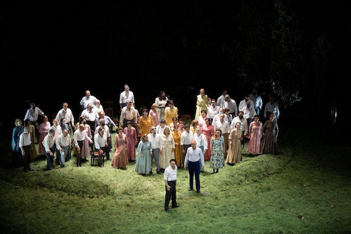 E poi il regista, che lascia che l’incandescente e iridescente materia – musica canto drammaturgia danza scene costumi luci – mostri tutta intera l’indicibile poesia del sentire, e tutta insieme concorra all’emozione e al turbamento, si prende la briga, ogni tanto, d’indicarci qualcosa, di sottolineare un aspetto, un punto di vista, oppure di aprirci gli occhi su una realtà altra, consista in un paesaggio lunare, un coro di festanti e colorati contadini alla luce delle torce, un indicibile abisso dell’anima, una candelina rimasta accesa, chissà perché, su una stupida torta d’onomastico dell’ormai disillusa adolescente: attraverso la crescente emozione lo spettacolo va avanti tra balli, duelli, latenti matrimoni, cenni d’allegria, tristezze malinconiche: e quando alla fine di un lungo percorso il cuore di Onegin, ora sì, è pronto finalmente a comprendere il mistero dell’amore, arriva il sofferto ma fermo rifiuto di Tat’jana, ormai sposata ad altro.