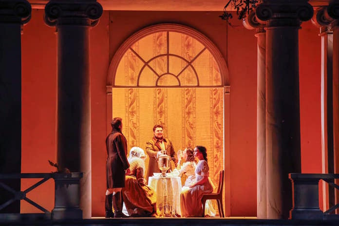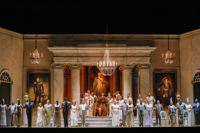 La scelta di Dimitry Bertman – talentuoso regista che firma lo spettacolo, produzione dell’Helicon-Opera di Mosca e portato in giro per il mondo con enorme successo – si può leggere in tanti modi, certo riflette l’improvviso straniamento del ritorno del protagonista in patria, e noi rimaniamo come lui attoniti per il salto spaziotemporale, nel bel mezzo del frastornante carosello di coppie che ci ballano intorno, stupiti di come il mondo ambisca mutar nelle forme e nei modi, per restar poi, sostanzialmente e desolatamente, uguale sempre e solo a se stesso.