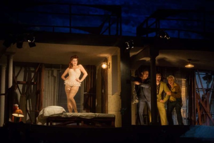 Un rullo di tamburo e squilli di tromba, grazie alla magistrale bacchetta d’orchestra di Rory Macdonald, siamo in scena. Una sagoma d’auto con tanto di Lord Rocburg e Lady Pamela, egli al volante, dopo una passeggiata per colline e valli, in una messa in scena che proietta sulla scenografia del Teatro dell’Opera, in rotazione bellissimi paesaggi, si ferma alla locanda dove si svolge la nostra vicenda.