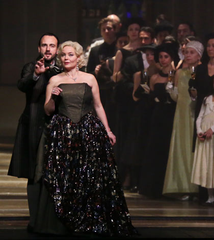 La regia di Jürgen Flimm e Gudrun Hartmann non si può dire che riesca nel difficile obiettivo di trasformare in storia moderna un dialogo a quattro dalla trama esilissima, di contenuto metafisico e metaforico. I cenni di drammaturgia, che pure ci sono, vengono interpretati simbolicamente, situando la scena in una brasserie parigina di inizio ‘900. Il tentativo è giustificato da alcuni riferimenti del libretto e dalle suggestioni della musica, che vengono sviluppati non tanto dai protagonisti, la cui azione è piuttosto limitata, quanto dalla miriade di personaggi che si susseguono sul palco.