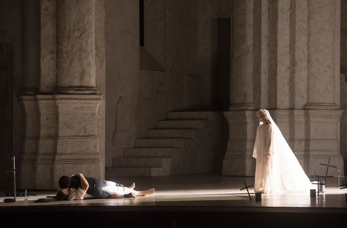 Il gioco della regia poi viene sorretto molto bene dalle scene di Giacomo Andronico che hanno il pregio di andare ben oltre al fatidico “funzionali” facendosi interpreti anch’esse dei tre atti. Eccellente l’utilizzo delle luci di Cesare Accetta riprese da Andrea Ricci: parte integrante dello spettacolo, creano momenti di rara poesia. Menzione a parte la riservo ai costumi di Gianluca Falaschi che hanno tutto quello che deve avere un costume di scena in uno spettacolo come questo e che spesso viene tralasciato: una precisa connotazione storica, una ottima sintonia con lo stato psicologico dei personaggi, una scelta cromatica adeguata alla scena. Tutti è tre gli elementi visivi dello spettacolo quindi concorrono verso un unico intento registico, raggiungendo così un livello di alto impatto teatrale.
