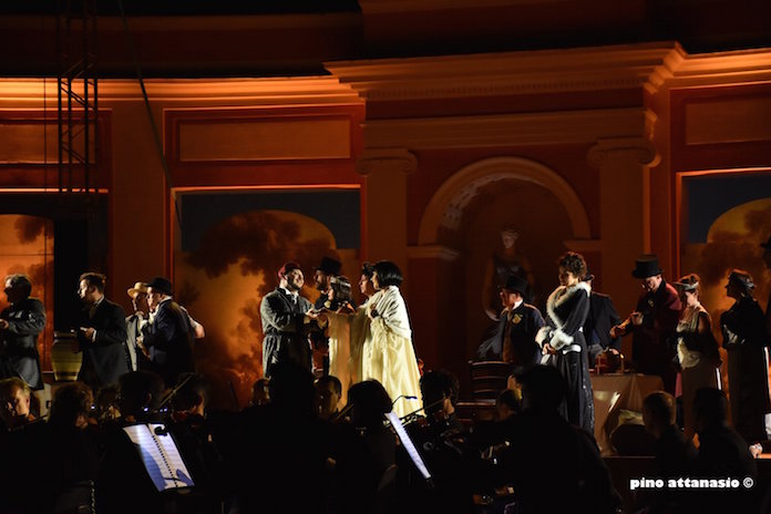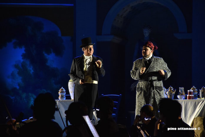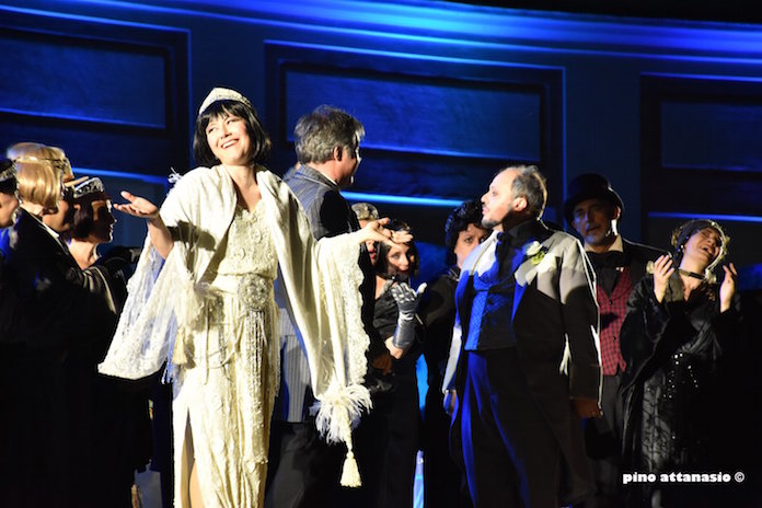 Sostanzialmente corretta la direzione di Giuseppe Montesano, che non forza mai i tempi di una tersa e tranquilla serata estiva, alla guida dell’Orchestra e del divertito Coro del Teatro San Carlo di Napoli. La regia di Riccardo Canessa s’inventa un’ambientazione nella Napoli bella époque, tra busti, cilindri e pagliette, e la storia in effetti ha caratteristiche tali da non soffrir per nulla del trapianto in quegli anni ruggenti e fuggitivi, di cui la messa in scena sa prender più che altro il lato estetico, immaginando magari i nostri personaggi, tra i Grandi Magazzini Mele e il Caffè Gambrinus, Piazza dei Martiri e la Galleria, incrociare Scarfoglio e la Serao, D’Annunzio e Di Giacomo nell’ultimo breve momento in cui la città vive ancora respiro di capitale europea, prima della catastrofe.