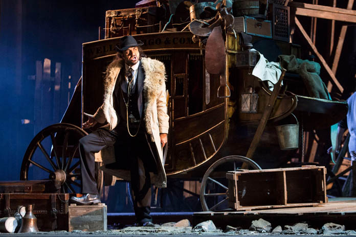 Trasporta, prima di tutto, il regista argentino, l’epoca della vicenda dal 1850 del libretto all’inizio del Novecento, probabilmente intorno a quel 1910 in cui l’opera fu composta: questo cambio d’epoca, pur non dichiarato dal regista, è evidente dalla presenza della luce elettrica – le lampade della Polka potrebbero essere anche a petrolio, ma il traliccio cui è appoggiata la capanna a mezzo monte di Minnie del secondo atto è inequivocabile – porta con sé almeno una conseguenza: se questo è un western – sicuramente, dichiaratamente, lo è, fin dal primo alzarsi del sipario, in cui lo sceriffo con un gesto brusco della mano apre un coloratissimo velario costituito da locandine di famosi film western – non è comunque un western classico, alla John Ford, per intenderci, ma un western crepuscolare, come avrebbero potuto farlo Sergio Leone o Clint Eastwood, “ripensamento” del west, sguardo critico, passione raccontata e ironica, riflesso di un passato mitico nelle incertezze dell’oggi, che perfettamente riverbera il carattere della musica.