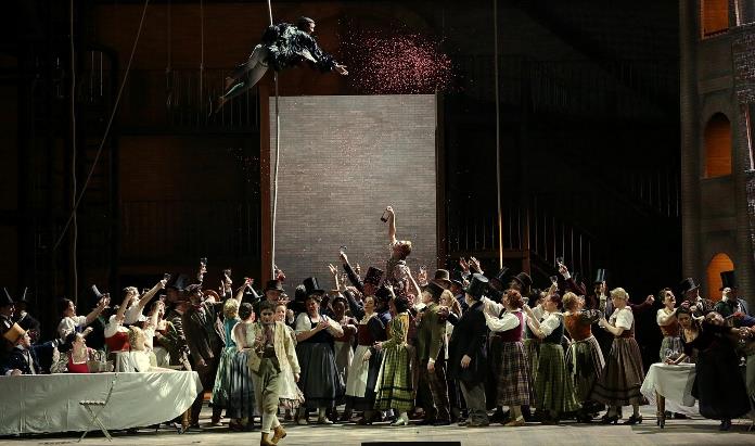 Pareti e fondali restano per tutte le tre abbondanti ore dello spettacolo, con qualche piccola variazione di collocazione e illuminazione. Ampie facciate in mattoni vivi e impalcature e scale in ferro battuto, quasi un ambiente da piena rivoluzione industriale, assai distante per epoca e concezione dall’ambientazione naturale dell’opera, che si vorrebbe collocata in un villaggio di contadini alle porte di Parigi agli inizi del XIX secolo. Ugualmente inutili all’ambientazione spaziotemporale i pochissimi oggetti di scena: lunghe tavolate grezze nella scena dell’arrivo di Giannetto e una grande uccelliera in cerchi e corde che cala dall’alto nella scena del terzetto tra Ninetta, il Podestà e Ferdinando. Di dubbio gusto la piccola fossa da sepoltura scavata in vera terra nella scena del processo e piuttosto pacchiano il carretto utilizzato spoglio nel corteo “funebre” di Ninetta e decorato da ghirlande e fiori nel finale trionfante.
