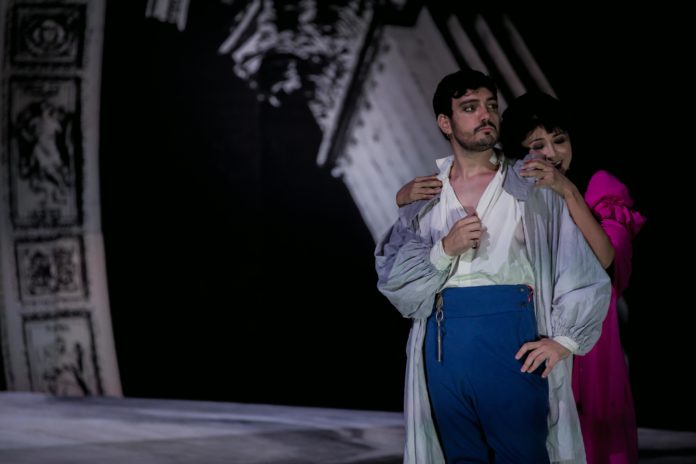 Sapiente e d’effetto il disegno luce di Valerio Alfieri, che proietta l’imponente ombra di San Michele Arcangelo a monito di ciò che sarà e sottolinea con maestria le scene cariche di pathos.