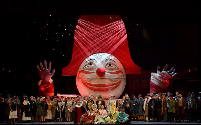 Troneggia così sulla scena il Burlamacco, anima della festa, nascosto da un lenzuolo bianco fino al disvelamento. E tutto il palco, dopo l’incipit della Cavalleria Rusticana, scelta registica che rende bene l’idea mascagnana, interrotta dall’irruzione sulla scena delle Maschere desiderose di un cambio di programma in loro favore a suon di striscione “Ogni uomo mente ma dategli una maschera e sarà sincero”, rivela come un grande laboratorio di carri di viareggina memoria, quasi un hangar della cittadella del Carnevale, dove infine prende corpo la testa festosa e ridanciana di un enorme Burlamacco, realizzato per l’occasione. Pochi gli altri oggetti di scena, arricchiti dall’utilizzo in toto del teatro, compresi platea e palchetti, per un coinvolgimento completo del pubblico. Grande la bellezza della raffinata Pavana, e la partecipazione per la coinvolgente Furlana, inserti accorti di un lungimirante Mascagni.