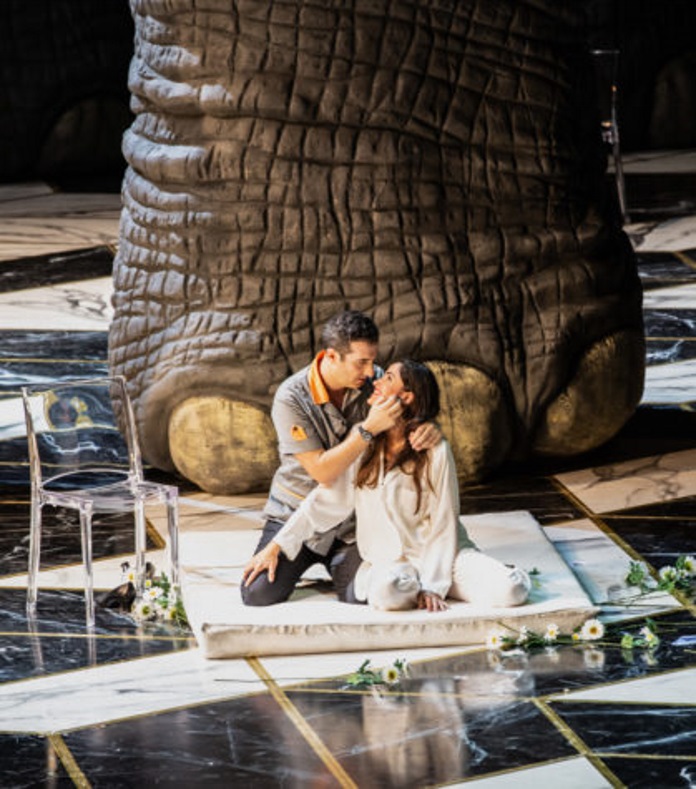 Il raggiro è il tema del secondo atto e Cherubino vestito da costei dovrebbe creare tentazione su di lui all’invito che la contessa gli ha fatto pervenire. Ma tutto va in ben altro modo: Conte e contessa vanno via in preda ad attrazione reciproca e Cherubino riesce a fuggire all’intimazione di esilio a Siviglia cui il nobile per gelosia lo aveva costretto. Davanti a delle zampe di elefante si riapre la scena, quattro atto divisi in due parti di due ciascuno, e Figaro presenta la famiglia per le nozze, in un salotto molto più televisivo che melodrammatico. Il conte è un tronista e la contessa una strappona con tanto di jeans strappati e scarpe décolleté dorate.