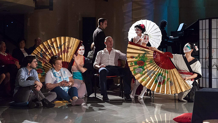Pochissimi gli oggetti di scena, qualche cuscino, un tavolino e un separé orientaleggiante. In kimono Cio-cio-san, in borghese Pinkerton. Fucile, bandierine, ventagli e palloncini i pochi strumenti a disposizione dei cantanti durante la recitazione. Un allestimento davvero essenziale, fondato sulla bravura dei protagonisti.
