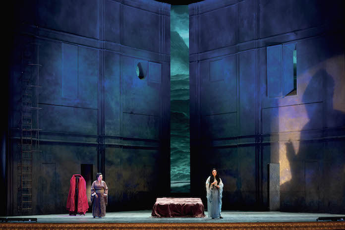 La seconda cosa che noti è – naturalmente – il mare. Il mare è una immane parete d’acqua oscura e in tempesta, che, a partire dalla linea di fondo del palcoscenico, dove la teatrale macchina a rulli del mare ne simula lo sciabordìo a riva alla maniera antica, sale sale incrociando onde e marosi schiumosi su su fino a infrangersi in buie scogliere, che non contrastano affatto col cielo, tempestoso e nuvoloso, che le opprime, piuttosto che illuminarle, confermandole nella luce livida d’un’eterna penombra. No, non ha proprio nulla di festoso, questo mare e questo villaggio costruito sulle sue rive, nulla di felice e vivo hai l’impressione possa accadervi, forse perché, e sarebbe da chiedersene ragione, il regista ha deciso di spostare l’azione d’una cinquantina d’anni in avanti, lasciando così gli anni speranzosi del secolo che si apre, per piombare in quelli asfittici e chiusi che inaugurano, invece, la seconda parte del Secolo breve, capitando a Nagasaki – e proprio a Nagasaki – pochi anni dopo l’unico conflitto nucleare che la storia dell’uomo abbia finora conosciuto. Non credo sia casuale, questa scelta, non può evidentemente esserlo, così importante è quel luogo in quel tempo per la storia umana, tuttavia, se questo dà indubbiamente ragione del cinereo e bigio ambiente, del sapore di morte che infetta uomini e cose, del tono plumbeo e opaco che assume l’intera scena, trovo che questo faccia singolare contrasto con la musica di Butterfly, opera che, meglio e più di tante altre coeve, è riuscita a cogliere in pieno quella deriva dell’impressionismo visivo e musicale che da noi si chiama Liberty, ma che altrove prende nomi ch’evocano la gioventù e il continuo rinnovarsi, come Jugendstil e Art Nouveau.