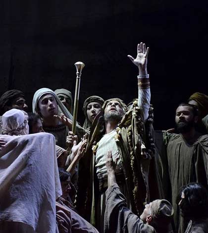 Ha una bella voce baritonale dal gran bel timbro scuro e potente, Leo An, che anche scenicamente ben sostiene i ricchi abiti del ruolo del titolo; quasi analogo discorso può valere per l’Abigaille di Rachele Stanisci, che, dotata di bel timbro sulle note scure che donano grand’efficacia alla definizione del personaggio, stride un po’ su quelle acute, soprattutto nei repentini saliscendi di quel virtuosismo vocale che, per la prima volta, definisce quell’equazione tra gorgheggio e ambigua falsità che è così presente nella sintassi melodrammatica verdiana. Voce potente e dalle sonorità piene ha il basso Abramo Rosalen, un Zaccaria ieratico e solenne, benché vistosamente l’interprete risulti ben più giovane dell’ottuagenario, benché energico, personaggio. Nella norma l’Ismaele di Antonio Corianò e la Fenena di Cinzia Chiarini, che non escono dalla convenzionalità dei rispettivi personaggi, amanti un po’ sacrificati in questo dramma che direttamente discende dai Quaresimali e che quindi ben poco spazio lascia all’erotismo: in futuro, anche qui, sarà diverso. Alla fine, grandi applausi per tutti gli interpreti e per il coro, guidato come sempre con grande professionalità da Franco Sebastiani, da parte di un pubblico che, sebbene non molto numeroso – molti i posti in platea rimasti vuoti – si è dimostrato prodigo di applausi anche, talvolta, ingenuamente o meno che sia, fuori tempo e contesto.