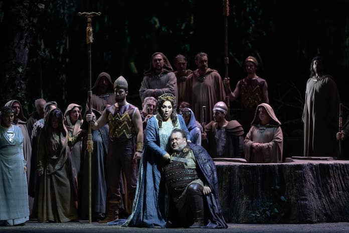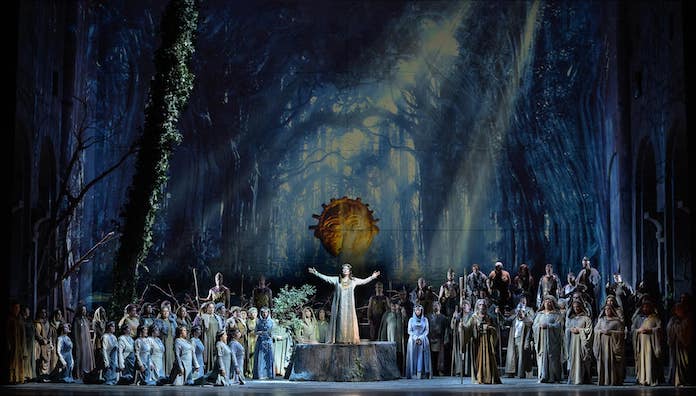 La regia di Lorenzo Amato continua a costituire la vera forza di questo allestimento, insieme alle scene di Ezio Frigerio, i costumi di Franca Squarciapino, le luci di Vincenzo Raponi, le proiezioni di Sergio Metalli: l’azione viene trasportata in un nonluogo e un nontempo, una Terra di Mezzo situata tra invenzione romantica e fantasy contemporaneo, in un contesto ricchissimo di citazioni e contaminazioni. Così, è facile vedere sotto i nostri occhi suggestioni che ci riportano alla pittura di una natura intatta e sublime che si rispecchia nelle querce enormi e nelle rocce immani e immanenti dell’arte di Friedrich, oppure al senso religioso e arcaicheggiante dei Nazareni come Overbeck o alla narrativa del primissimo romanticismo tedesco di Novalis, alle atmosfere che diresti ante litteram della surrealtà umorale di E.T.A. Hoffmann o alle originalità visionarie e audaci di Hölderlin; è facile cogliere, tuttavia, anche richiami etnografici, spaziando dalle maschere funerarie achee a quelle africane che tanto suggestionarono Picasso, trasmutate in idolo, in totem evocato dalla sacralità di Norma; infine anche la fiction fantasy più contemporanea ci mette lo zampino, con citazioni esplicite al Signore degli Anelli o al Trono di Spade.